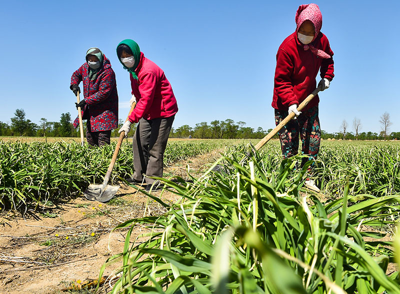 2020年5月11日,農(nóng)民在山西省大同市云州區(qū)西坪鎮(zhèn)唐家堡村邊的黃花菜地里除草。新華社發(fā)(柴婷 攝)