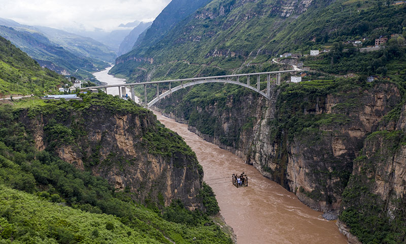 游客們在體驗云南省巧家縣茂租鎮(zhèn)鸚哥村村民蔣世學(xué)操作的溜索過江(2020年8月14日攝,無人機照片)。新華社記者 江文耀 攝