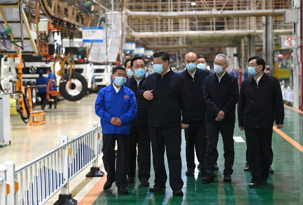 ↑2020年4月22日,習近平在陜西汽車控股集團有限公司總裝車間察看生產線,了解產品研發(fā)、生產、銷售和復工復產情況。