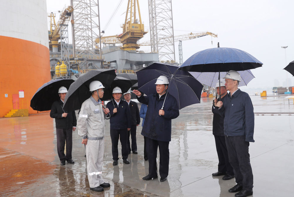 ↑2018年6月13日,習近平在山東煙臺考察,冒雨來到中集來福士海洋工程有限公司煙臺基地,視察海洋工程設備建設場地。
