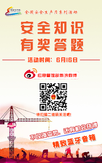 6月16日,應(yīng)急管理部新浪微博賬號(hào)將圍繞有限空間、交通安全、礦山安全、危化品、生活安全、自然災(zāi)害等生產(chǎn)生活中常見(jiàn)安全內(nèi)容開(kāi)展安全知識(shí)答題活動(dòng),提高應(yīng)急避險(xiǎn)和自救互救能力,參與活動(dòng)還有機(jī)會(huì)獲得精美禮品。