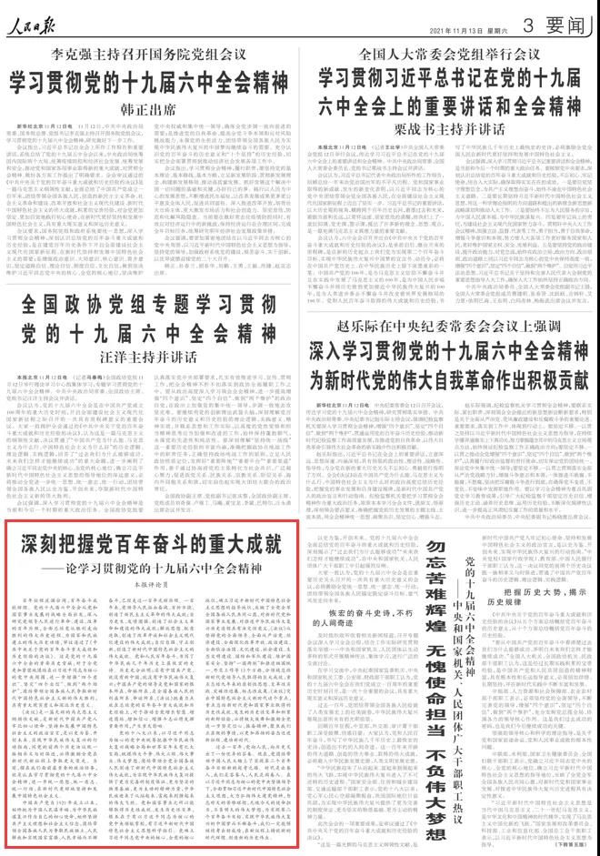 重磅!人民日報(bào)八論學(xué)習(xí)貫徹黨的十九屆六中全會(huì)精神