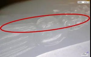 經(jīng)過檢測(cè)人員的仔細(xì)觀察發(fā)現(xiàn),有皮色部位與白色主體接觸的部位具有強(qiáng)藍(lán)白色熒光,且形成封閉的環(huán)形;在特殊角度下使用高倍顯微鏡觀察,可以看到非常細(xì)小的拼合縫,如不留意觀察則極難發(fā)現(xiàn)。