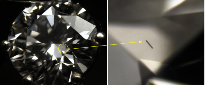 圖4左圖為實驗室培育鉆石樣品;右圖為放大條件下觀察可見棒狀金屬包體