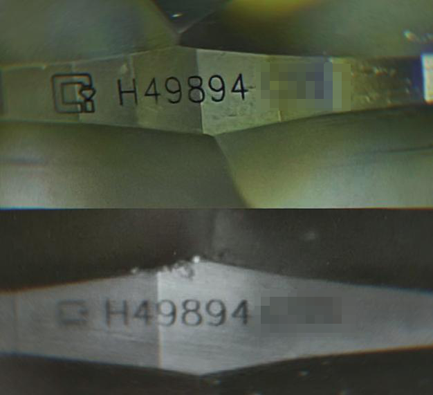 圖3上為仿冒刻字,下為珠寶國檢(NGTC)上海實驗室樣品刻字圖