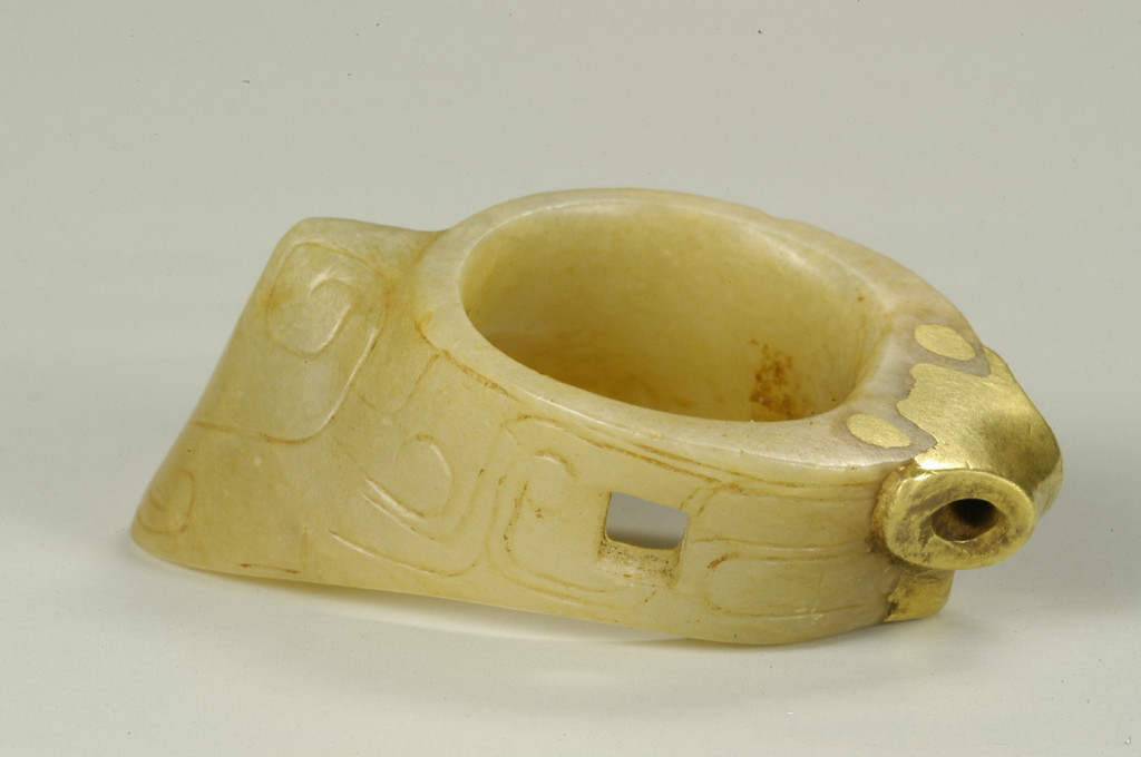 鷹首鑲金玉韘[she?]出土于陜西渭南韓城市梁帶村遺址27號墓。白玉,微透明,局部受沁。斜筒狀,斷面呈橢圓形,表面裝飾陰線云紋。正面筒壁較長,有鼻狀凸起,背面筒壁較短,中央縱向凸起一棱脊,脊上部有一穿孔,并鑲有金質(zhì)鷹首,尖喙,圓眼,雙眼為穿孔。筒壁一側(cè)有一方形孔,用于鑲制金質(zhì)扳突。