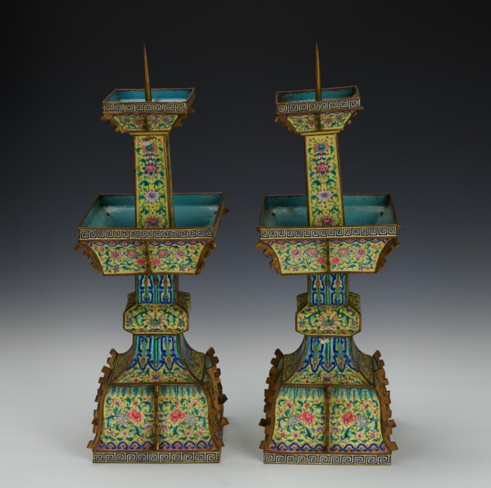 燭臺共兩件,形制相同。銅胎。由上下兩盤、承柱、方形高圈足組成,上盤內(nèi)有銅釬用以插燭,器身飾扉棱。盤內(nèi)壁施淺藍色琺瑯釉,外壁以黃色琺瑯釉為地,飾回紋、纏枝花卉紋、蕉葉紋、如意云頭紋等。