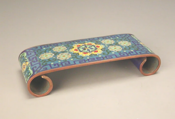 這件遼寧營口市博物館館藏的清代掐絲琺瑯墨床,長21厘米,寬9厘米,高4.3厘米,銅胎,長方條幾形,雙足內(nèi)卷,面嵌左右對稱的掐絲琺瑯勾云團花紋飾。造型柔和流暢,掐絲細勻,紋飾繁密,打磨光滑,鍍金明亮,藍釉青翠艷麗,整件作品小巧精制,令人愛不釋手,是一件很典型的清代掐絲琺瑯器物,極具當時金光燦爛、豪華富貴的藝術(shù)風格。