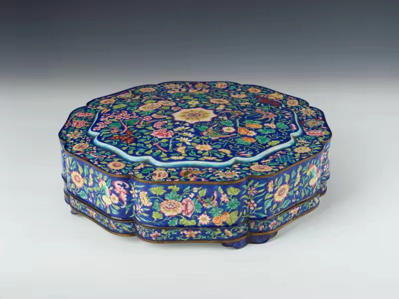 畫琺瑯攢盒,明代。銅胎,呈花瓣式,直壁,平底,云頭形足,內(nèi)置攢盤九個。外壁以寶藍(lán)色琺瑯釉為地,滿飾花、果、蝴蝶、八吉祥等紋;攢盤施天藍(lán)色琺瑯釉,內(nèi)書紅色“囍”字。此盒造型別致,花紋繁麗,用筆細(xì)膩,色彩豐富,釉色鮮艷、純正,給人雍容華貴之感;將吉祥寓意的紋飾融進(jìn)花卉中,表達(dá)了人們美好的祝福。