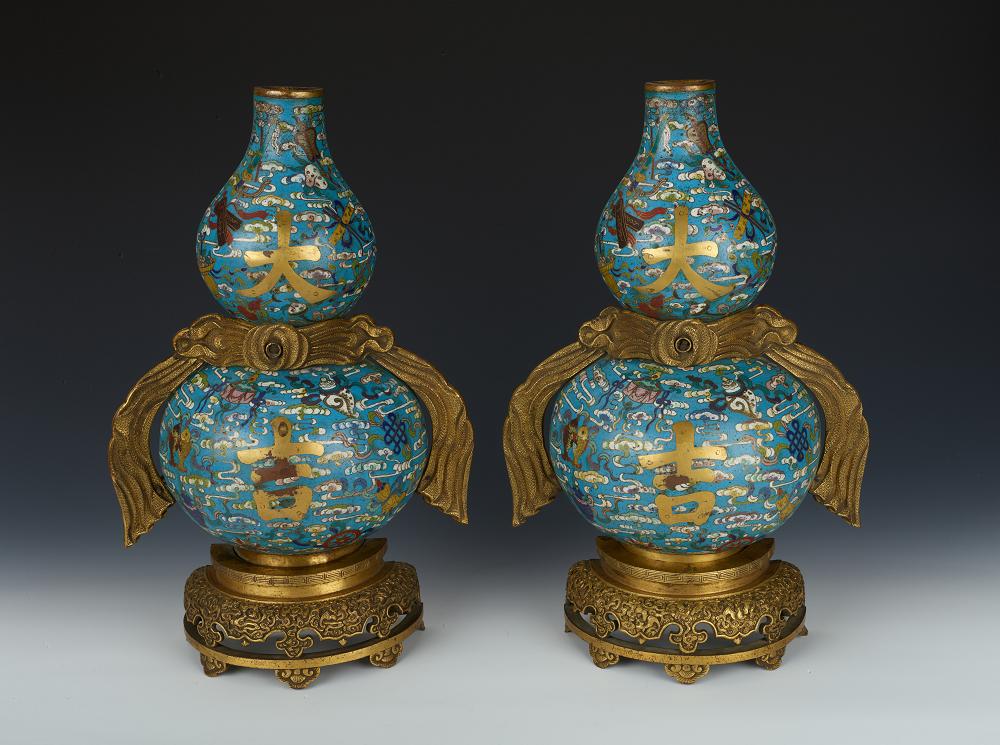 “大吉”掐絲琺瑯葫蘆瓶,明代。此對壁瓶銅胎鍍金,材質、做工及紋飾均相同,可合二為一體。束腰飾鍍金飄帶,鏤空“福壽如意”紋銅座,如意云頭形足;以淺藍色琺瑯釉為地,上部飾暗八仙紋,下部飾八吉祥紋,間飾朵云紋,上、下腹中心鎏金楷書“大”“吉”二字。