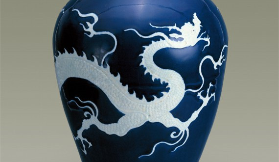 霽藍(lán)釉白龍紋梅瓶是元代瓷器制品的代表作,也是元代藍(lán)釉器中極為引人注目的藝術(shù)珍品。霽藍(lán)釉是化學(xué)元素鈷的呈色,最早見于唐三彩和唐白釉藍(lán)彩上,但這些都屬于低溫藍(lán)釉。元代,景德鎮(zhèn)的瓷工熟練地掌握了呈色劑制作方法,成功地?zé)瞥隽烁邷厮{(lán)釉。收藏于揚(yáng)州博物館的這件霽藍(lán)釉白龍紋梅瓶就是景德鎮(zhèn)窯高溫藍(lán)釉的杰出作品。