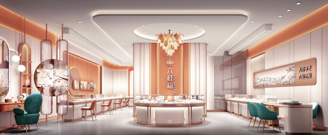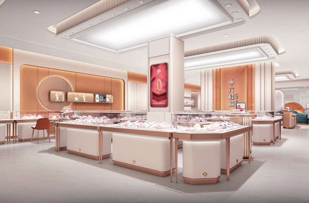 作為積極弘揚(yáng)東方黃金珠寶文化的品牌之一,六桂福珠寶不斷從五千年的中華優(yōu)秀傳統(tǒng)文化中汲取靈感。六桂福珠寶全新終端門店以“新國風(fēng)”概念融入創(chuàng)意設(shè)計(jì),將中華優(yōu)秀傳統(tǒng)文化、現(xiàn)代美學(xué)、“桂樹”圖騰、珠寶肌理、品牌格調(diào)與國潮風(fēng)尚融為一體,營造出富有特色的“五感六覺”終端品牌門店文化氛圍?!拔甯小痹谟诰耋w驗(yàn),“六覺”在于情景營造,兩者相輔相成,共同為消費(fèi)者帶來精神愉悅的沉浸式情景體驗(yàn)。