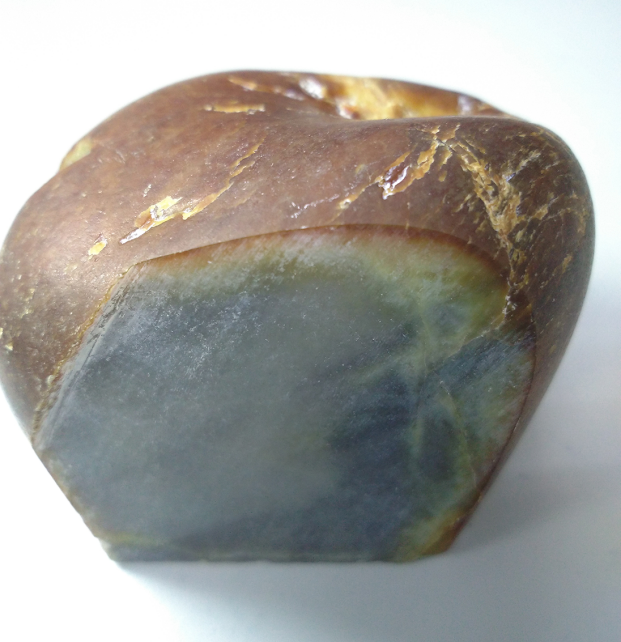 拼合和田玉,表面的皮色與玉石主體由粘合劑粘結(jié)在一起