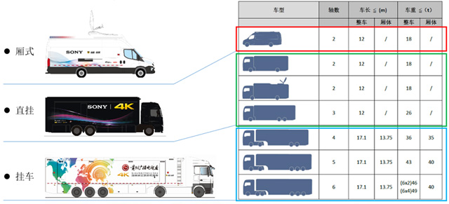 廂式轉(zhuǎn)播車尺寸多依賴于廂式底盤的原有尺寸和載重,配備4~8訊道;操作簡便、靈活、機(jī)動(dòng)性強(qiáng),不受大型貨車限行影響,對(duì)駕駛員要求不高,有的甚至C本就可以駕駛,對(duì)于小規(guī)模的節(jié)目制作尤為便利。3噸~7噸, 有的車型載重太小,很容易超重;廂式車內(nèi)高通常在1.8米~2米,選擇帶空氣懸掛的,不過有些底盤尤其是客車類底盤,空氣懸掛太軟,也是不太推薦的。