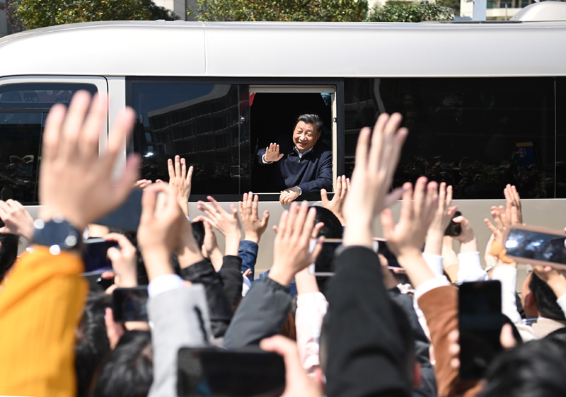 3月22日至25日,中共中央總書記、國家主席、中央軍委主席習近平在福建考察。這是25日上午,習近平在福州閩江學院考察時,向師生們揮手致意。新華社記者 王曄 攝