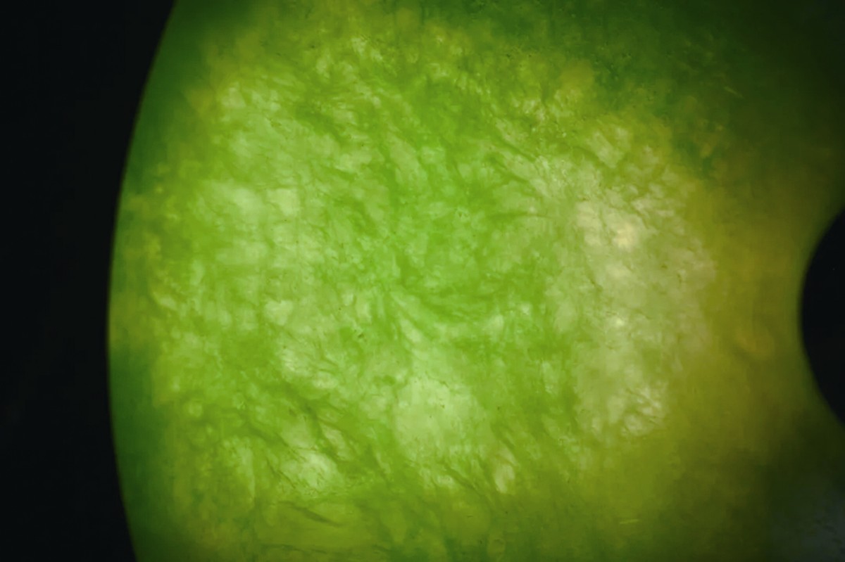 染色處理的翡翠,染劑沿裂隙進入翡翠內(nèi)部,呈絲網(wǎng)狀分布?,F(xiàn)在,染色處理往往和漂白、充填處理同時進行,有時顏色分布異?,F(xiàn)象更為明顯。覆膜翡翠,放大檢查顏色均勻,呈樹脂光澤,無顆粒感,可見氣泡或覆膜脫落。
