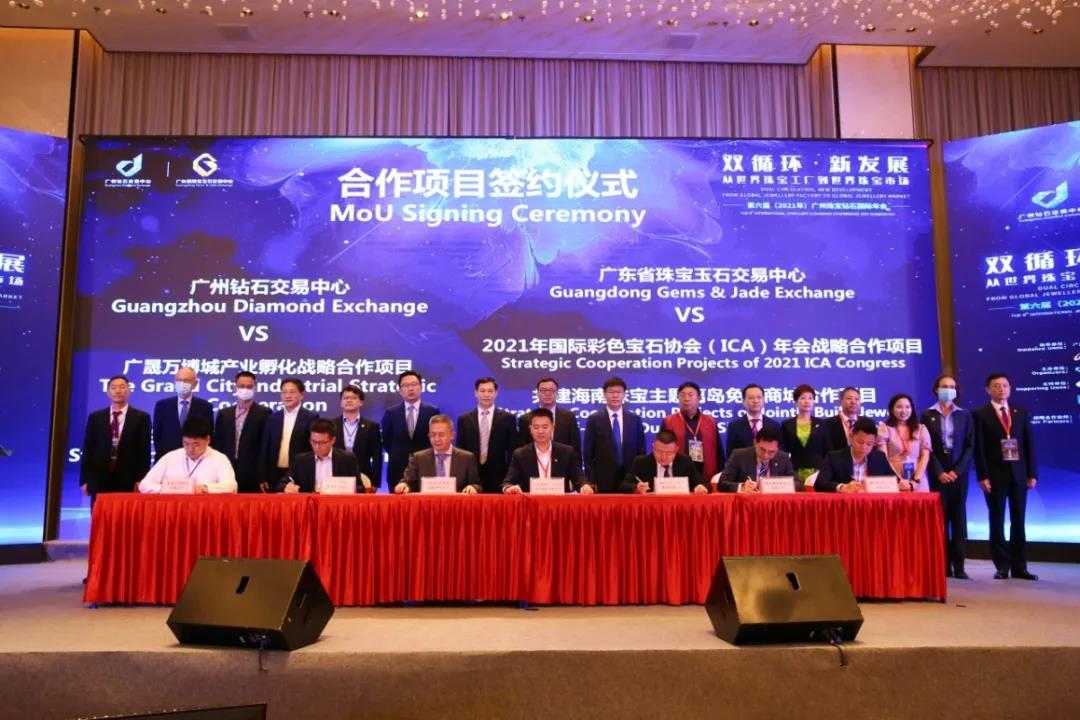開幕式上,廣州鉆石交易中心(以下簡稱廣鉆中心)和 廣東省珠寶玉石交易中心(以下簡稱廣東寶交中心)分別就廣晟萬博城產(chǎn)業(yè)孵化戰(zhàn)略合作項目、易高生態(tài)科技有限公司戰(zhàn)略合作項目、2021年國際彩色寶石協(xié)會(ICA)年會戰(zhàn)略合作項目、共建海南珠寶主題離島免稅商城合作項目、彩色寶石原料競價交易會合作項目等與合作伙伴簽署競價交易合作協(xié)議,旨在匯聚行業(yè)內(nèi)外資源構(gòu)筑多元化、現(xiàn)代化鉆石珠寶行業(yè)服務(wù)樞紐。