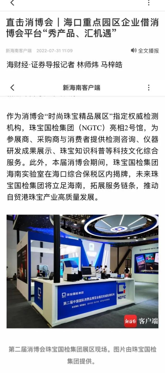 7月25日-30日,珠寶國(guó)檢集團(tuán)受邀參加第二屆中國(guó)國(guó)際消費(fèi)品博覽會(huì)(下簡(jiǎn)稱消博會(huì)),作為權(quán)威的國(guó)家級(jí)珠寶檢測(cè)機(jī)構(gòu),珠寶國(guó)檢集團(tuán)為消博會(huì)提供的綜合科技服務(wù)得到參展商、采購(gòu)商、消費(fèi)者的一致好評(píng);在消博會(huì)期間,珠寶國(guó)檢集團(tuán)受邀出席海口市招商引資推介會(huì)暨重點(diǎn)項(xiàng)目簽約儀式,珠寶國(guó)檢集團(tuán)海南實(shí)驗(yàn)室正式揭牌,以科技服務(wù)海南自貿(mào)港珠寶玉石產(chǎn)業(yè)發(fā)展。以上系列服務(wù)與舉措獲得海南電視臺(tái)新聞?lì)l道、海南日?qǐng)?bào)、海南日?qǐng)?bào)客戶端、??谌?qǐng)?bào)等媒體的關(guān)注與報(bào)道。