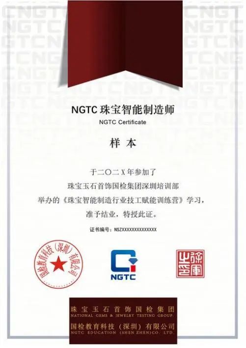 國檢教育科技(深圳)有限公司為本期培訓(xùn)班學(xué)員提供培訓(xùn)評價(jià)服務(wù),經(jīng)考核合格的學(xué)員,將獲得“NGTC珠寶智能制作師”認(rèn)證證書。