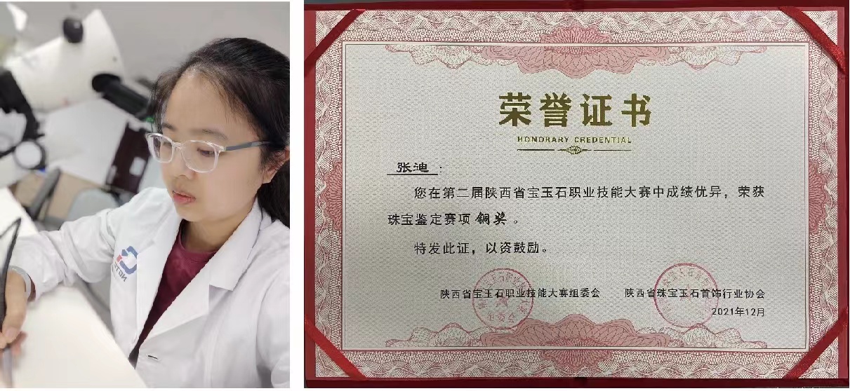 岳盼獲得“陜西省技術(shù)能手”稱號(hào)和珠寶鑒定賽事銀獎(jiǎng)