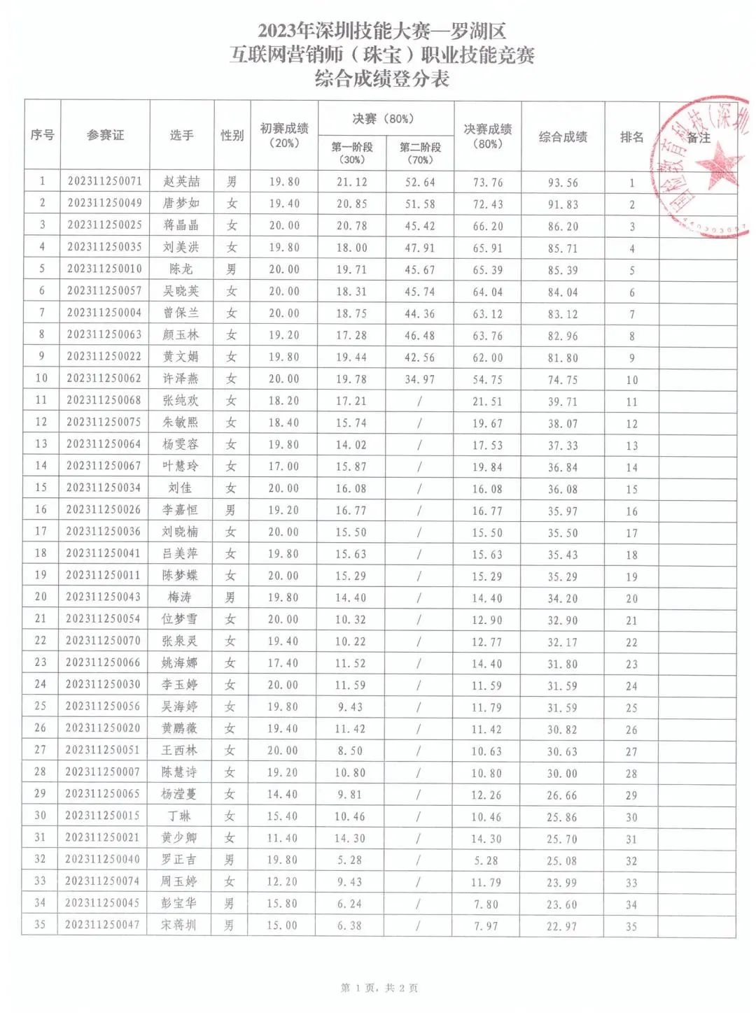 根據(jù)《羅湖區(qū)互聯(lián)網(wǎng)營銷師(珠寶)職業(yè)技能競(jìng)賽方案》要求,競(jìng)賽組委會(huì)于2023年12月3日開展羅湖區(qū)互聯(lián)網(wǎng)營銷師(珠寶)職業(yè)技能競(jìng)賽決賽已順利結(jié)束,現(xiàn)將綜合成績及排名公布表予以公示。