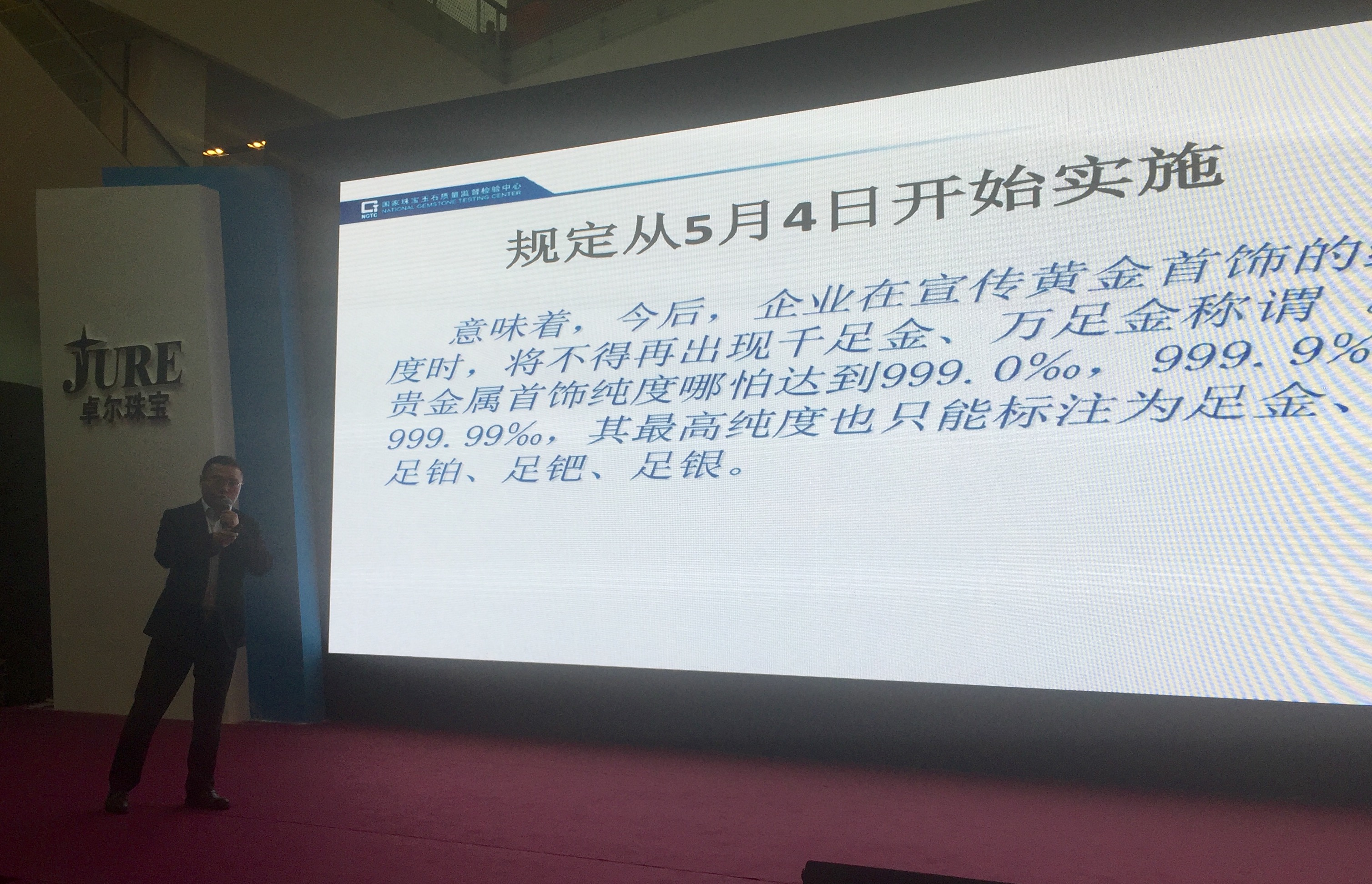 今日,國家珠寶玉石質(zhì)量監(jiān)督檢驗(yàn)中心上海實(shí)驗(yàn)室貴金屬室主任周楓 ,在上海世博物館為觀眾解讀黃金新標(biāo)準(zhǔn)。根據(jù)黃金首飾等的新國標(biāo)(GB11887—2012第1號修改單),貴金屬首飾將統(tǒng)一以足金、足鉑、足鈀、足銀標(biāo)稱。這標(biāo)志著沿用了十多年的千足金稱謂將取消,不規(guī)范標(biāo)注的萬足金、萬純真金、萬足真金等都將退出歷史舞臺。