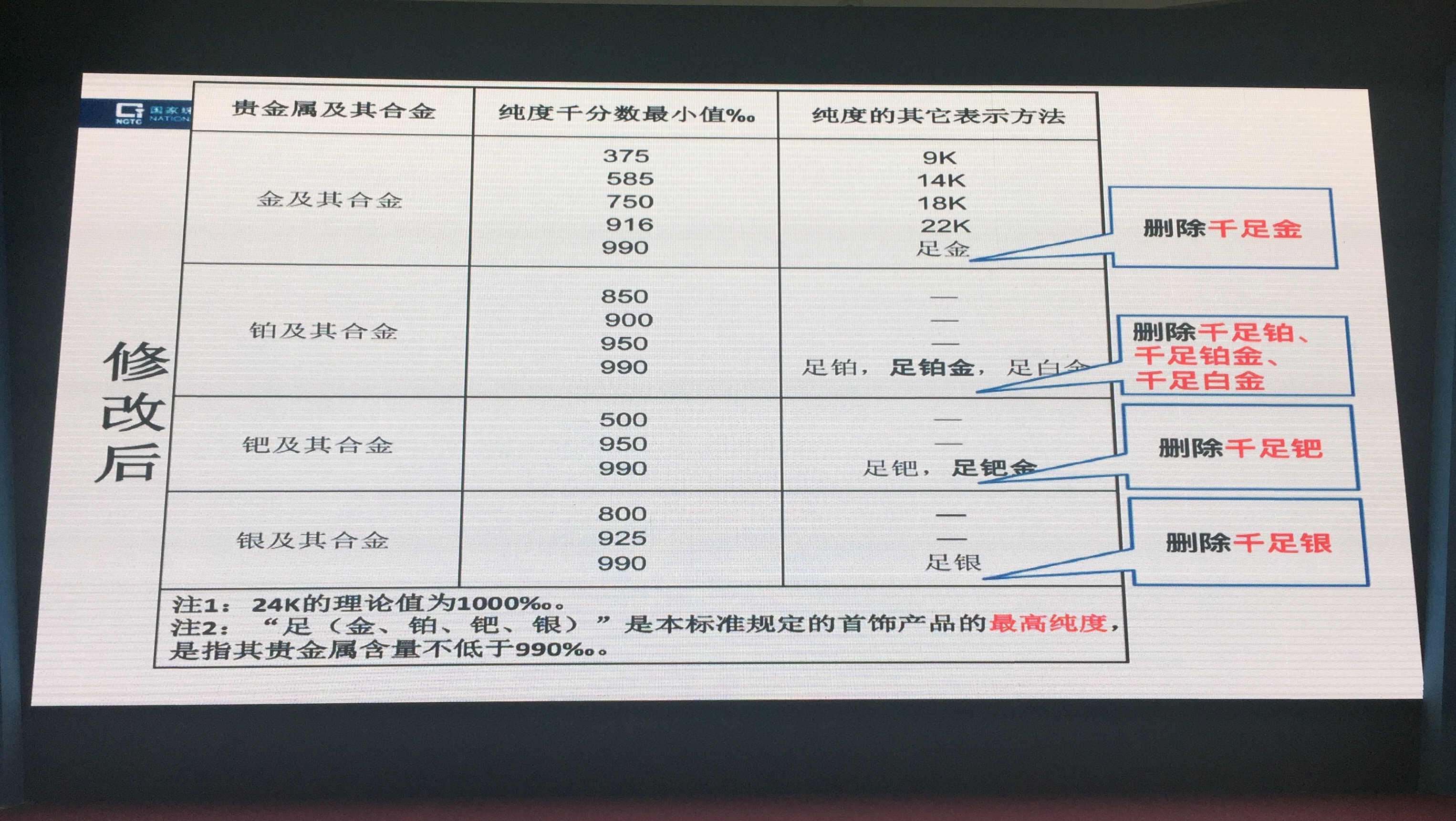 國家標(biāo)準(zhǔn)化管理委員會批準(zhǔn)發(fā)布GB 11887-2012《首飾貴金屬純度的規(guī)定及命名方法》第1號修改單2015年2月11日正式發(fā)布,2016年5月4日起開始實(shí)施。這意味著,今后既或是貴金屬首飾的純度達(dá)到99.9%或99.99%,也要統(tǒng)一用足金(銀、鉑、鈀)來命名。