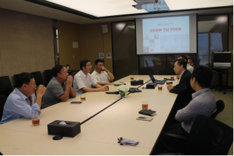 葉志斌主任(左三),孫鳳民同志(左二)與周大福董事、中國(guó)區(qū)總經(jīng)理陳世昌(右二)在熱情地交談