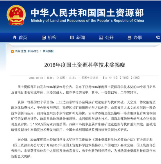 國土資源部官網(wǎng)報道2016年科學(xué)技術(shù)獎新聞