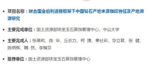 10月18日,國土資源部發(fā)布2016年第24號公告,國土資源部珠寶玉石首飾管理中心(NGTC)和中山大學(xué)的合作項目“聯(lián)合國金伯利進程框架下中國鉆石產(chǎn)地來源指紋特征及產(chǎn)地溯源研究”喜獲國土資源科學(xué)技術(shù)獎二等獎!