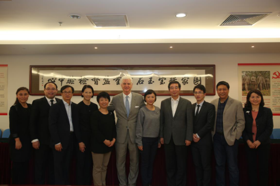寶石中心葉志斌主任(右四),柯捷副主任(左五)帶領(lǐng)中心相關(guān)領(lǐng)導(dǎo)與Forevermark永恒印記總裁、世界鉆石生產(chǎn)商協(xié)會(huì)主席Stephen Lussier(左六)一行合影