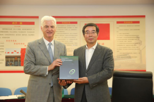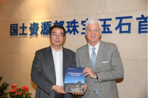 葉志斌主任(左)向Stephen Lussier 總裁(右)贈(zèng)送中心的研究著作《聯(lián)合國(guó)金伯利進(jìn)程框架下的鉆石原產(chǎn)地研究》