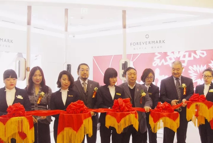 國家珠寶玉石質(zhì)量監(jiān)督檢驗(yàn)中心(NGTC)副主任孫鳳民先生(右四),瑞恩鉆飾董事長兼總經(jīng)理薛雷先生(右二),F(xiàn)orevermark?永恒印記?北區(qū)銷售經(jīng)理劉爽女士(左二),悠唐廣場總經(jīng)理中野先生(左四)出席開業(yè)活動(dòng)并剪彩