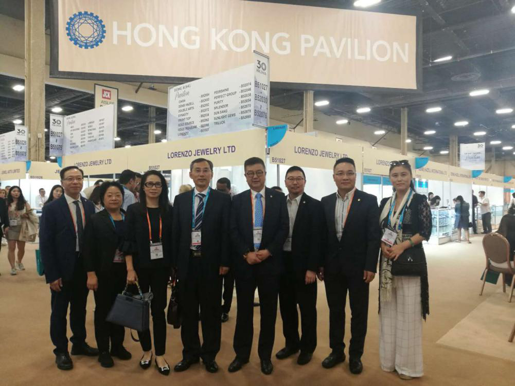 NGTC副主任張曉(左四)帶團(tuán)與香港珠寶制造業(yè)廠商會(JMA)杜源寧主席(右四)一行在JCK展香港展區(qū)合影