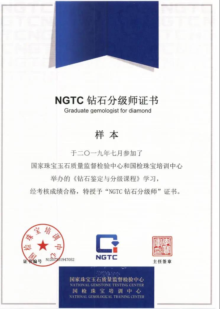 三年內(nèi)擁有“鉆石分級(jí)師”、“彩色寶石鑒定師”和“翡翠鑒定師”三種證書,單科成績超過75分,并提交一篇論文,便可獲得國家珠寶玉石質(zhì)量監(jiān)督檢驗(yàn)中心和國檢珠寶培訓(xùn)中心聯(lián)合頒發(fā)的“NGTC寶石學(xué)家”證書。