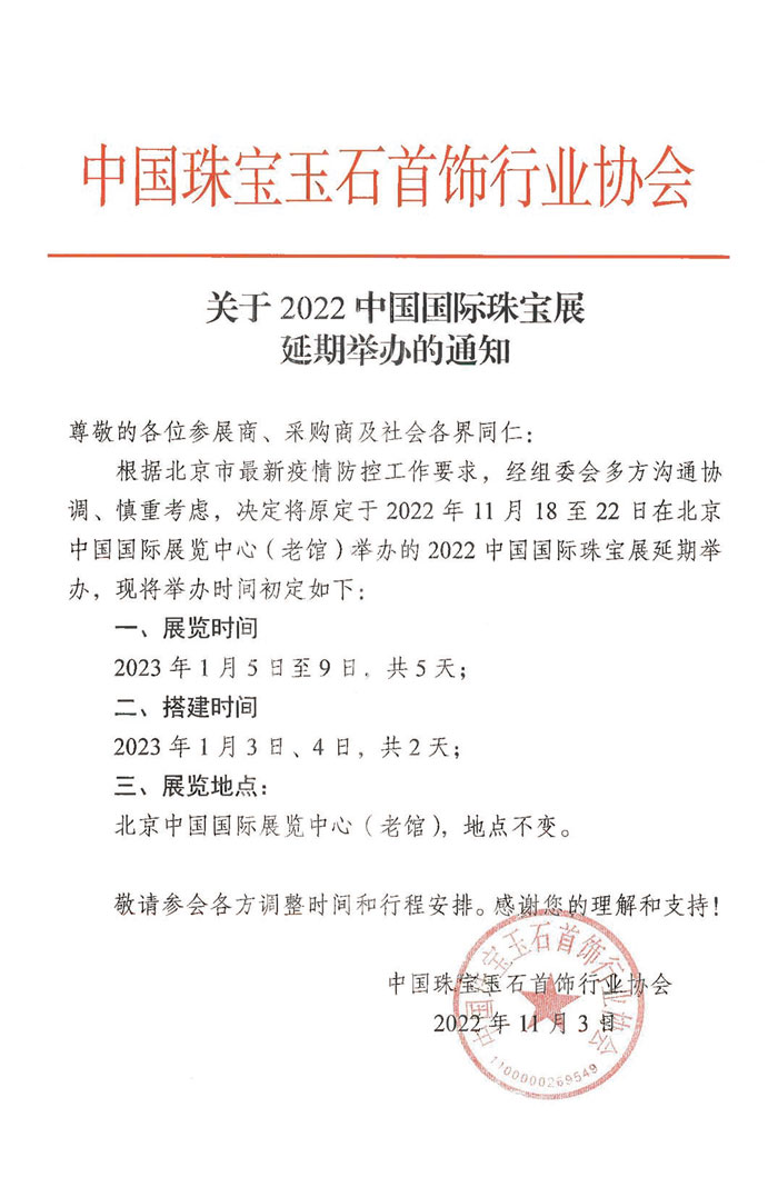 關(guān)于2022中國(guó)國(guó)際珠寶展延期舉辦的通知